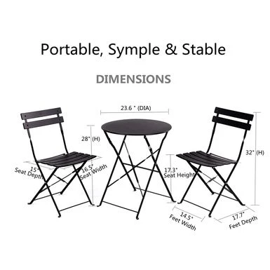 Size of Table: 23.6″(DIA) X 28″(H). Chair: 17.7″(D) X 14.5″(W) X 32″(H).