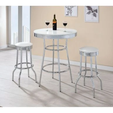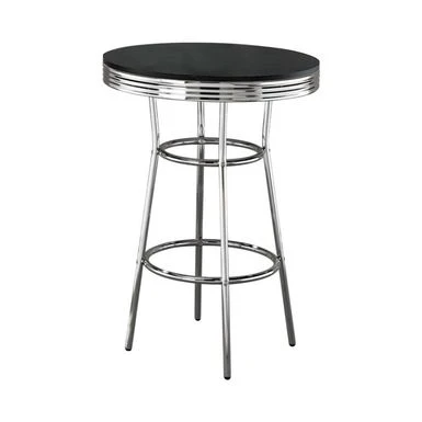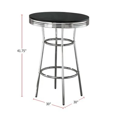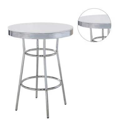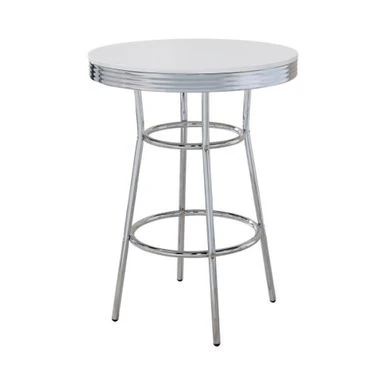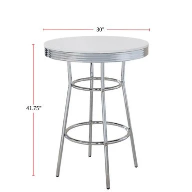 Bring back the charm of a 50s soda fountain with this versatile 30-inch round bar table. With its sleek and simple design, it’s an ideal spot for holding drinks or snacks. The high-shine chrome base and white tabletop add a touch of sophistication to any space. Move it around easily to suit your needs. Complete the look with matching chrome barstools.