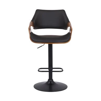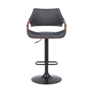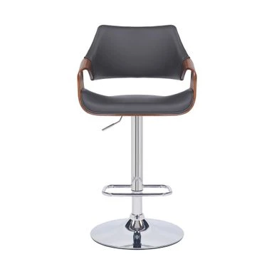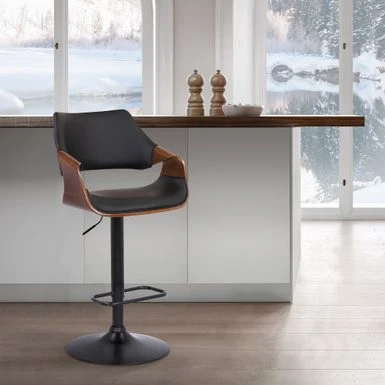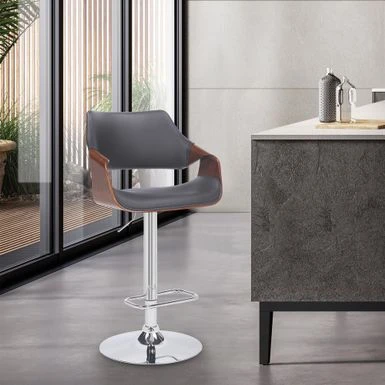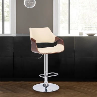 The Armen Living Aspen Adjustable Swivel Faux Leather and Wood Bar Stool with Metal Base is an ideal addition to any home. The adjustable seat height functionality allows you to use this stool at your kitchen island, home bar, or peninsula without having to worry about the surface height. The convenient swivel function optimizes everyday use or entertaining, keeping everyone engaged regardless of their place in the room. The plush padded and high-density foam seat and backrest atop a strong pedestal base that create a sturdy and comfortable seating experience. Wrapped in luxurious faux leather upholstery and complimented by beautiful walnut wood accents, the Aspen stool has a mid-century silhouette that exudes timeless beauty that will last for many years to come. The Aspen Adjustable Swivel Faux Leather and Walnut Wood Bar Stool is available in black, grey, or cream upholstery with walnut wood accents and a black or chrome metal base.