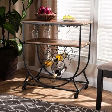 Enhance your space with the industrial warmth and character of the vintage inspired Dania wine cart. Made in China, the Dania is comprised of a black finished metal frame fitted with two walnut brown finished wood shelves. Enhance your space with the industrial warmth and character of the vintage inspired Dania wine cart. Made in China, the Dania is comprised of a black finished metal frame fitted with two walnut brown finished wood shelves. The built-in wine rack holds 15 bottles of your finest wines, while the stemware rack provides secure storage for glasses. Requiring assembly, the Dania is also fitted with wheel casters to provide smooth mobility. A chic and functional wine storage solution, the Dania wine cart easily upgrades the modern home… Black finished metal frame Style: vintage Materials: mdf, iron Color: black, walnut Walnut brown finished MDF wood shelves Two (2) shelves Stemware rack Wine rack holds 15 bottles Includes: one (1) cart Assembly: assembly required Care instruction: wipe clean Tabletop dimensions: 29.30″ wide x 16.10″ deep Shelf dimensions: 7.5″ high x 28″ wide x 13.75″ deep Product weight: 26.2 lbs.
