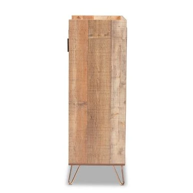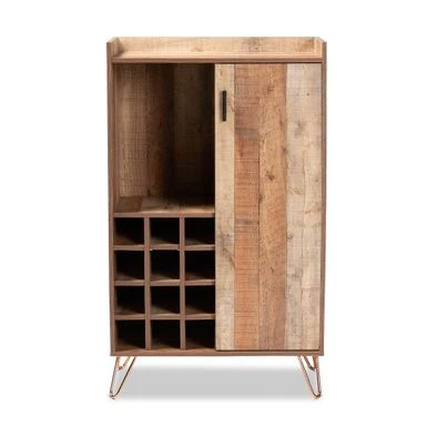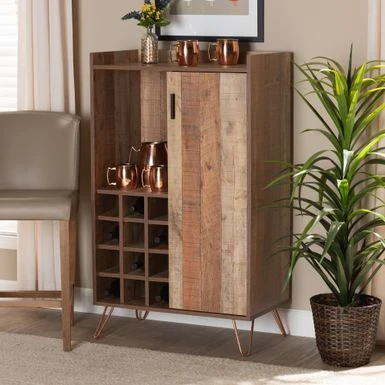 Display and store your wine collection in style with the Mathis wine cabinet. Made in Malaysia, this wooden cabinet features a rustic brown finish for a cool, modern look. Twelve individual wine cubbies provide space to store wine bottles. One open shelf and three internal shelves behind a door provide additional storage space. Requiring assembly, the cabinet is fitted with a rose gold finished metal hairpin legs and a black door handle for a sleek, contemporary touch. An excellent storage option with modern style, the Mathis wine cabinet is ready to enhance the modern home.