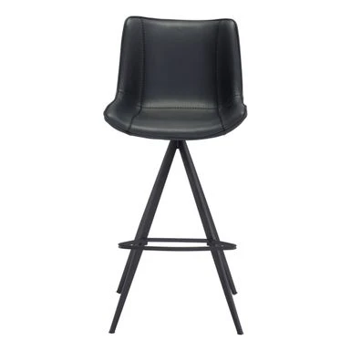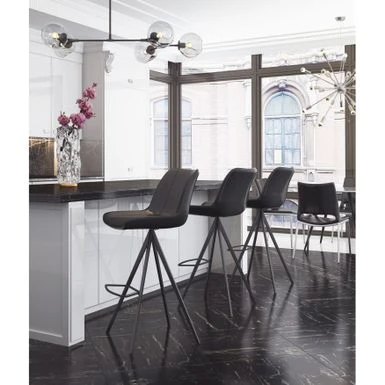 Handsome with the right amount of rugged, this bar chair is the perfect compliment to your kitchen island or bar area. Its scooped seat in black faux leather rests on slim splayed legs in black with an attached footrest. Handsome with the right amount of rugged, this bar chair is the perfect compliment to your kitchen island or bar area. Its scooped seat in black faux leather rests on slim splayed legs in black with an attached footrest. Stitched detail gives it texture and dimension. Protective plastic feet keep your floors scratch-free.. Warm water and mild soap with soft towel.