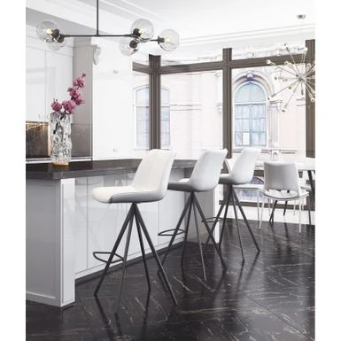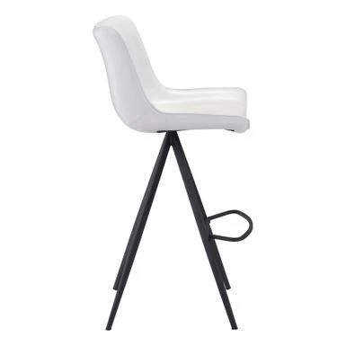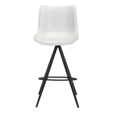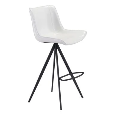 Handsome with the right amount of rugged, this bar chair is the perfect compliment to your kitchen island or bar area. Its scooped seat in white faux leather rests on slim splayed legs in black with an attached footrest. Handsome with the right amount of rugged, this bar chair is the perfect compliment to your kitchen island or bar area. Its scooped seat in white faux leather rests on slim splayed legs in black with an attached footrest. Stitched detail gives it texture and dimension. Protective plastic feet keep your floors scratch-free.. Warm water and mild soap with soft towel.