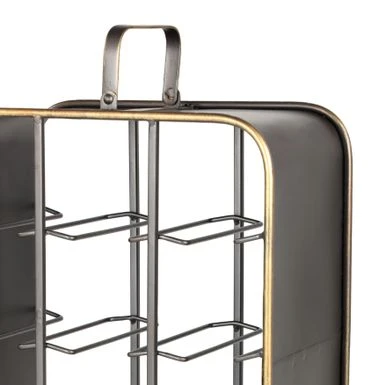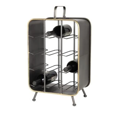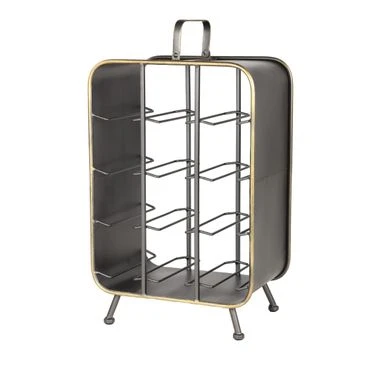 - Large black metal wine holder with handle, feet, and gold trim