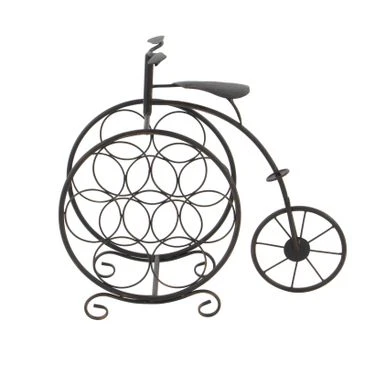 Add a little whimsy to your wine and cheese night with this bicycle bottle wine holder. Designed with felt or rubber stoppers at the base that prevent scratching furniture and table tops, as well as sliding around. This item ships in 1 carton. Iron wine rack makes a great gift for any occasion. Suitable for indoor use only. Maximum weight limit is 10 lbs. This is a single wine rack. Rustic style. Brass wine rack can hold 7 average wine bottles.