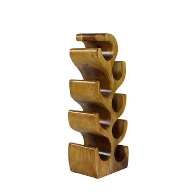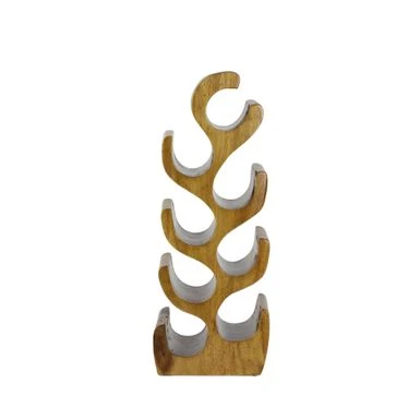 Both a rustic wood sculpture and a functional standing wine rack, this smooth, amber-colored acacia wood wine rack holds 6 standard-sized bottles beautifully while adding natural charm to your dining room or bar area. Made of solid sustainable acacia wood, hand-carved into a smooth, dimensional wood sculpture, this bottle rack has a versatile natural shape, like a vine growing upwards or sea coral The natural texture of the wood grain and warm brown hues complement any color palette. Set against a solid white wall, this wooden wine floor rack really pops with animated, natural movement.