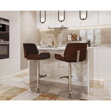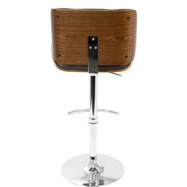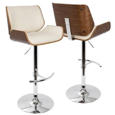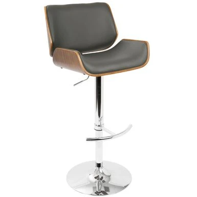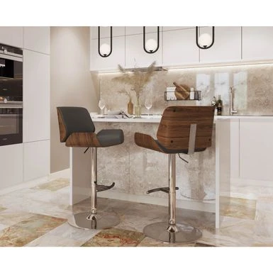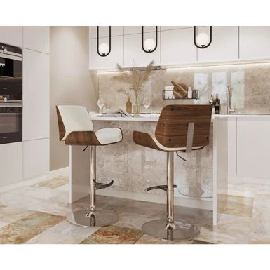 Elevate your counter seating with the sleek and durable Tranas Bar Stool. Crafted from hardwood, this mid-century modern style barstool features a foam-padded curved seat and back upholstered with faux leather for added comfort. The chrome-finished base is height-adjustable and includes a curved footrest, while the swivel function ensures easy movement. Choose from walnut or cherry-finished wood and cream, brown, or grey upholstery to suit your decor.