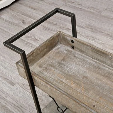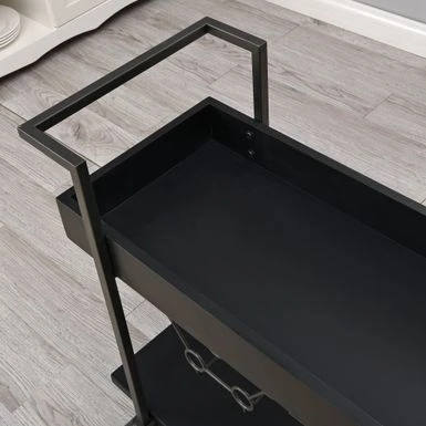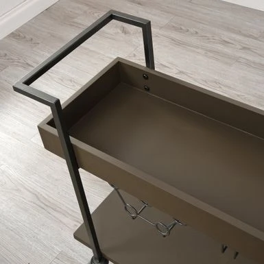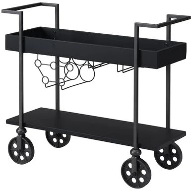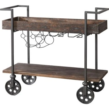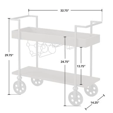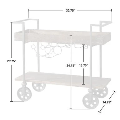 Impress your guests with our FirsTime & Co. Factory Row Industrial Farmhouse Wheeled Bar Cart. This rustic brown wheeled cart features two wood shelves, wine glass racks, and ample storage for wine bottles and other essentials. With its industrial factory cart wheels, this versatile furniture piece can also be used as a kitchen island cart, dining storage, or console table. Measuring 29.75″ in height, 32.75″ in width, and 14.25″ in depth, it is the perfect, functional accent piece for any kitchen or bar. Bring industrial style into your home with this stylish and decorative piece from FirsTime & Co.