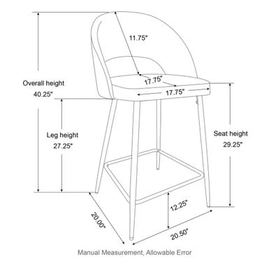 - 20.05 inches long x 20 inches wide x 40.25 inches high (seat height 30 inches)