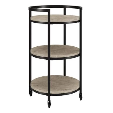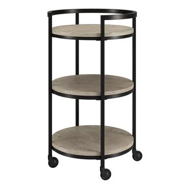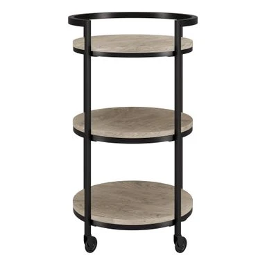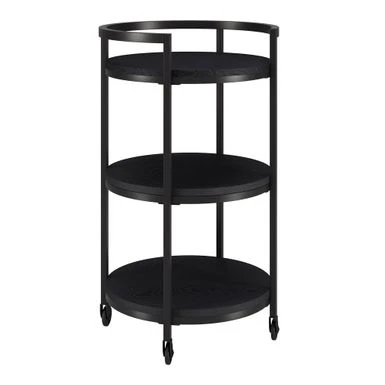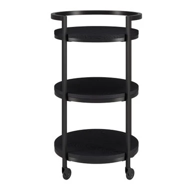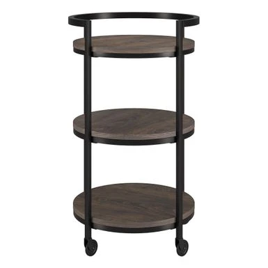 Combine functionality and on-trend design with this eye-catching modern bar cart. Its round wood-finish MDF shelves are offset by the clean lines of the steel blackened bronze frame. The raised frame provides security for your bottles and mixers while the four wheels provide easy mobility from room to room. Not a party animal? Re-purpose this piece as a coffee station, mobile vanity, or nightstand!