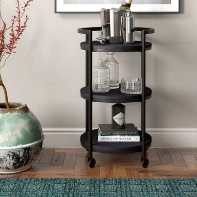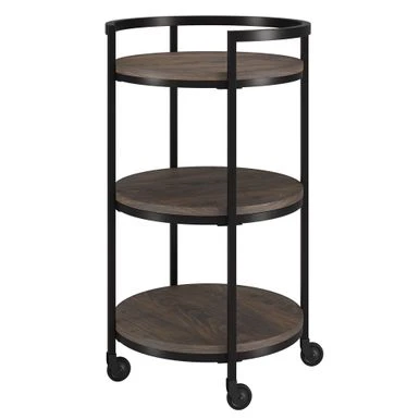 Combine functionality and on-trend design with this eye-catching modern bar cart. Its round wood-finish MDF shelves are offset by the clean lines of the steel blackened bronze frame. The raised frame provides security for your bottles and mixers while the four wheels provide easy mobility from room to room. Not a party animal? Re-purpose this piece as a coffee station, mobile vanity, or nightstand!