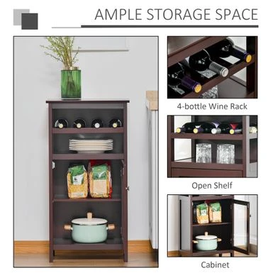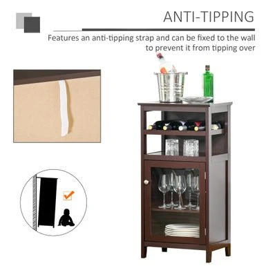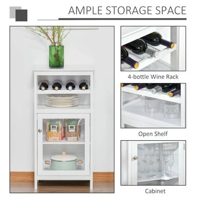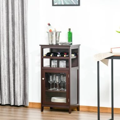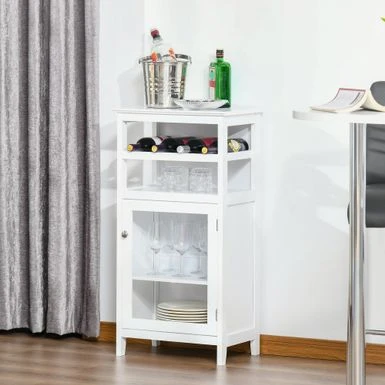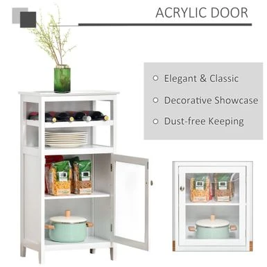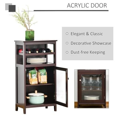 Ready to organize your dining space? This HomCom storage cabinet gets you ready in no time. This wine cabinet combines both open and closed storage for wine bottles and daily essentials. One adjustable shelf accommodates various storage needs. The acrylic door offers a beautiful way to display your collectables or dishes while keeping the dust off. The elevated base protects your wine rack cabinet from getting damaged during a spill. Add functionality to your dining area with HomCom.