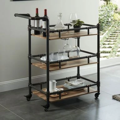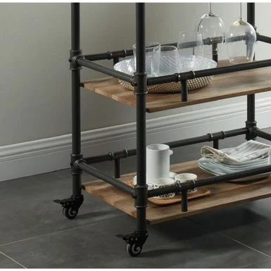 For storage, the serving cart has three bottom shelves. This three tier serving cart is handpicked to match your rustic dining setup. For storage, the serving cart has three bottom shelves. This three tier serving cart is handpicked to match your rustic dining setup. Intended to spruce up any industrial style kitchen or dining space, this pipe-inspired design and a metal frame work serving cart is the perfect piece to show off favorite glasses or drinkware.
