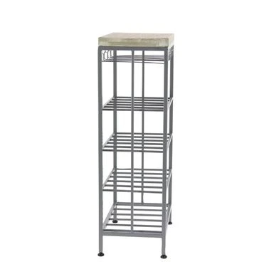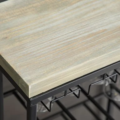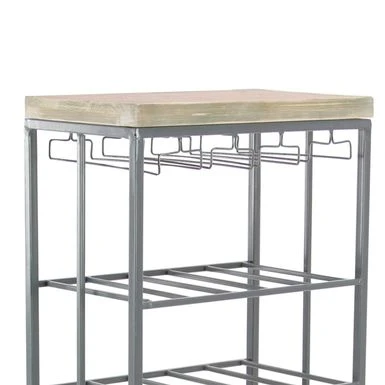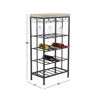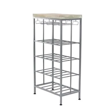 Compact and stylish, this Industrial-style wine rack will make the perfect addition to your space. The wine rack features a wooden top and a 4-tier polished iron frame with open rack shelves, perfect for stowing your long or oversized bottles. The rack is outfitted with a hanging wine glass rack, while round stoppers at the base prevent the rack from sliding or scratching your floor.