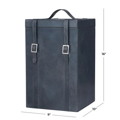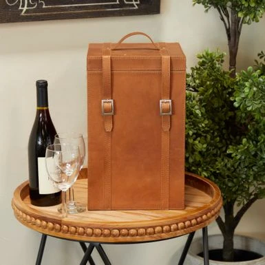 Enjoy your wine or drinks on your next travel with this leather wine bottle holder that comes in a chic and sleek style. Showoff your bottle beverage collection in the most elegant way with this wine holder. Made from sturdy and long lasting material featuring real leather for a chic yet durable design. Suitable for indoor use only. This item comes shipped in one carton. Leather and hair on hide are natural products, and therefore no two will be alike. There may slight variations in pattern, natural blemishes, colors, and overall aesthetic of the product. Made in India. Modern design. This wine holder can contain 4 bottles.