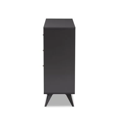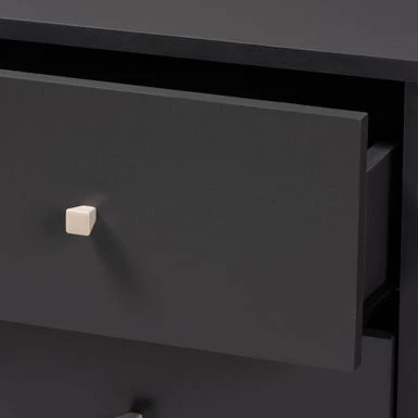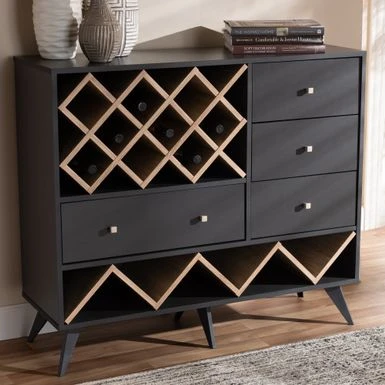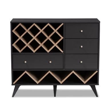 Display your wine collection in style with the Savino wine cabinet. The Savino is constructed from durable engineered wood and displays a sleek finish. Display your wine collection in style with the Savino wine cabinet. The Savino is constructed from durable engineered wood and displays a sleek finish. The cabinet features built in wine racks that can accommodate storage for up to twelve bottles of wine. Mid-century modern wine cabinet Style: mid-century Materials: particle board, mdf with pu paper Color: dark grey/oak brown, white/walnut brown Engineered wood construction Two-tone finish Wine rack storage for up to 12 wine bottles Four drawers Includes: one (1) wine cabinet Assembly: assembly required Care instruction: wipe clean Overall: 35.59 inches high x 40.55 inches wide x 13.78 inches deep Left drawer: 3.54 inches high x 20.87 inches wide x 11.02 inches deep Right drawers: 3.54 inches high x 12.99 inches wide x 11.02 inches deep Lower wine rack: 7.87 inches high x 7.87 inches wide x 12.99 inches deep Wine racks: 3.74 inches high x 3.74 inches wide x 12.99 inches deep Legs: 5.8 inches high Product weight: 113.84 lbs.