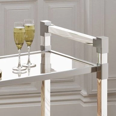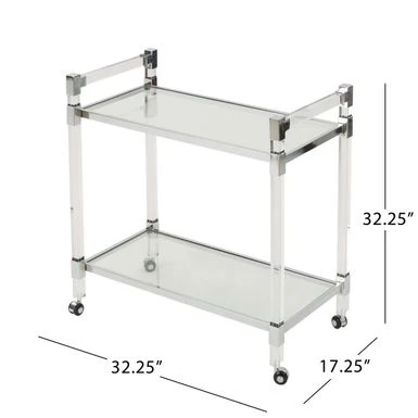 This bar trolley is a wonderful addition to any home. Use it to serve your guests dinner without having to balance everything, or you can serve tea for desert in style. The possibilities are only limited to your imagination Featuring tempered glass shelves with a clear plastic frame, this trolley will be a fan favorite for all your events.
