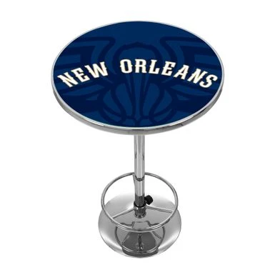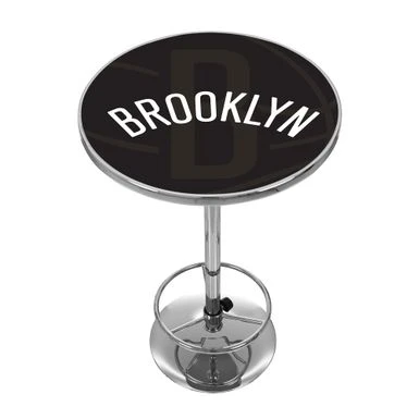 Elevate your game room or garage with this NBA Chrome Pub Table in Fade design. The table top can be customized with your preferred team logo and features a durable acrylic surface with a chrome finished plastic banding. The chrome base is lightweight yet sturdy, and comes with an adjustable footrest for maximum comfort. Perfect for game nights or casual hangouts, this pub table combines style, function, and comfort all in one.