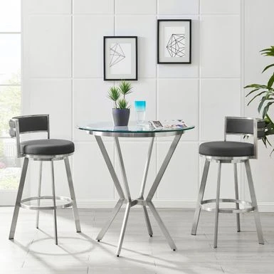 The Roman Swivel Bar Stool from Armen Living is a versatile piece that fits seamlessly into any decor style. With a durable metal frame and luxuriously wrapped gray faux leather upholstery, this stool is easy to clean and built to last. The thick foam-padded cushion ensures maximum comfort during long periods of use, while the convenient metal footrest provides additional support and stability. The stool also features a smooth 360-degree swivel function for optimal mobility. Choose from multiple color options to fit your existing design theme. Assembly is hassle-free with clear and concise instructions included. Armen Living proudly stands behind all products with a 1-year limited manufacturer warranty. The Roman counter stool is available with soft grey faux leather upholstery and your choice of black or brushed stainless steel finishes.Â