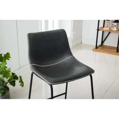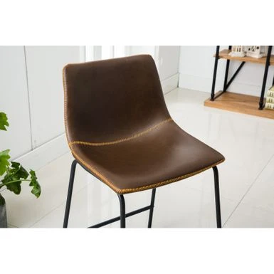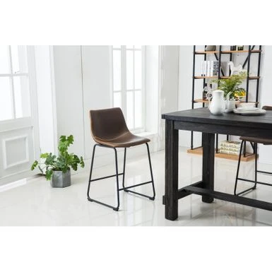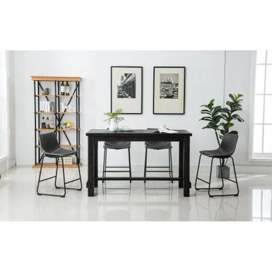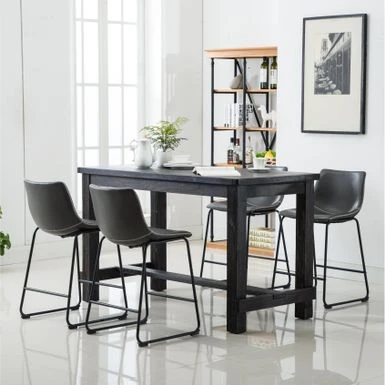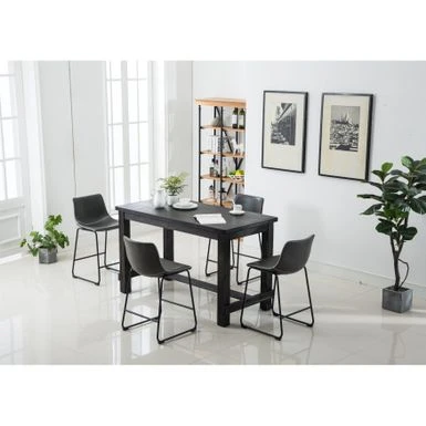 Create an industrial dining area with the Bronco 5-piece set. The weathered wood and veneer table is paired with four metal and PU leather stools, detailed with stitched bucket seats and footrests for comfort. Choose from three upholstery colors to meld with your modern decor.