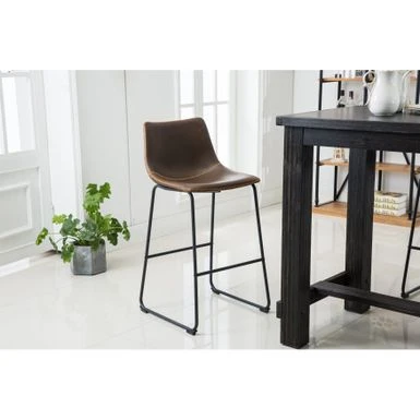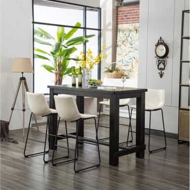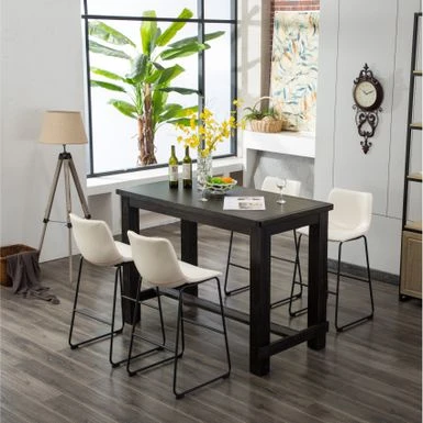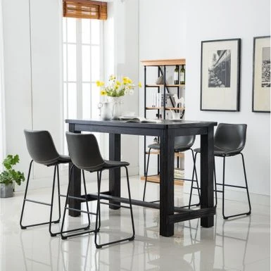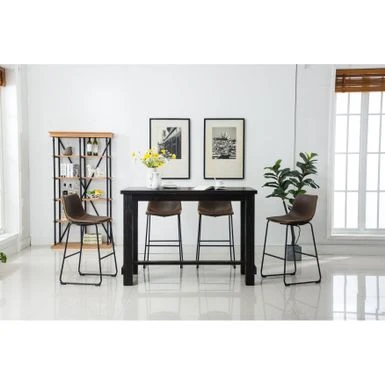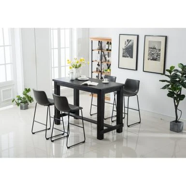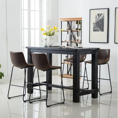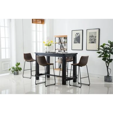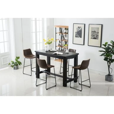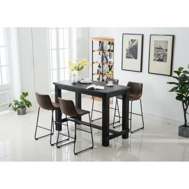 Inspired by the sheer simplicity and weatherworn beauty of primitive furniture, Bronco Antique Wood Finished Dining Table with Faux Leather Chairs Set brings a relaxed sense of style into your space. It provides an ample amount of seating, making it a versatile option that can accommodate both your family and guests. Enjoy cozy, intimate dinners and gatherings around the Bronco Dining Table. The Bronco Dining Chairs offers a sculpted seat/ back design and is upholstered in soft smooth PU with a black metal frame. This style is available in dining height, counter height and bar height in Bronco collection. This set includes one table and four chairs.