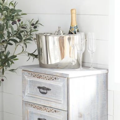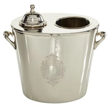 Enjoy your chilled wine, champagne, or beer in style with this glossy traditional stainless steel ice bucket with handles. Display your wine bottles with style and make everyone thirsty with envy. Looks stylish in your living room or kitchen as a way to display and serve your favorite wines. This item comes shipped in one carton. Lid-covered ice pour to retain cold temperature. Suitable for indoor use only. Made in India. This wine cooler can hold up to 1 standard size wine bottles. Traditional theme.