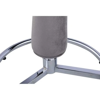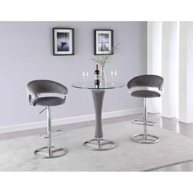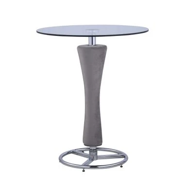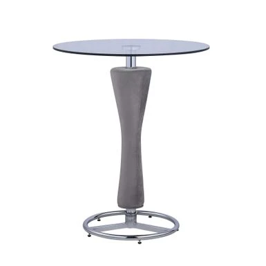 This contemporary pub table features a round, clear tempered glass top on a chrome pedestal with a cushioned pedestal upholstered in gray fabric and an open wheel chrome base.