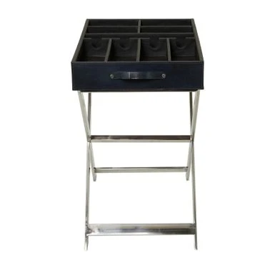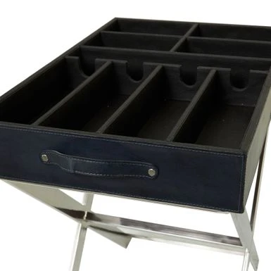- This functional table inspired wine storage is furnished with a black leather exterior and a silver stainless steel stand