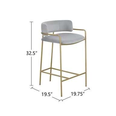 A soft and supple grey velvet envelops the comfy padded seat and linear backrest of this chic and glamorous stool. Situated and supported by a slim rod-like frame in a gold finish, this stool offers an air of sophistication to any bar top or kitchen island. The cool grey upholstery and warm metallic finish contrast, leaving a striking visual to any space. With a retro flair and glam vibe, this elegant stool is perfectly suited for a mid-century style home or contemporary entertainment room.
