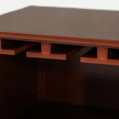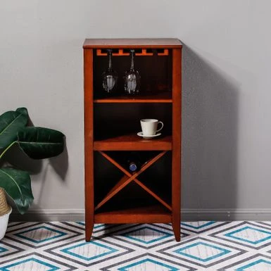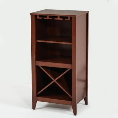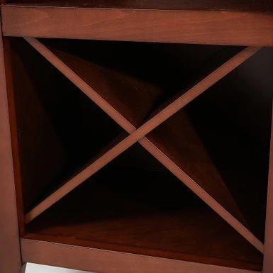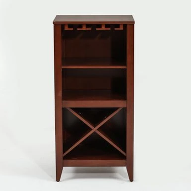 The smartly designed components of this wine cabinet provide storage for your wine glasses and bottles, bar tools and linens, and every other mixologist must-have. This compact cabinet is perfect for small spaces that need extra storage. Enjoy a distinctive way to store your wine reserve with the refined elegance of the x-shelf cabinet that can hold up to 12 wine bottles. The top storage compartment has a built-in rack for hanging your wine glasses. The middle compartment is an open space that is a convenient storage solution for your bar accessories. In a beautiful walnut finish, this wine storage cabinet will add style and function to your home’s decor.