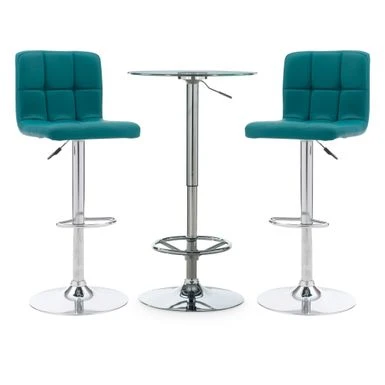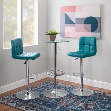 - Set includes chic rounded glass pub table and two modern stools