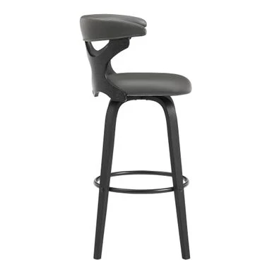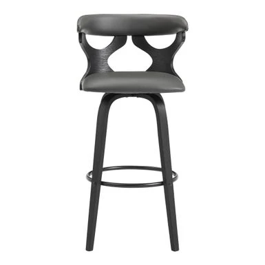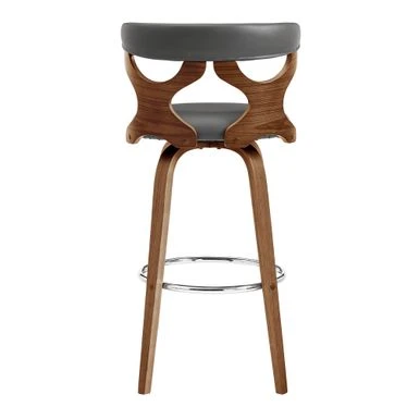 Upgrade your home with the modern and stylish Zenia Swivel Bar Stool in Faux Leather and Wood. The unique geometric chair back adds extra flair to this piece, while the 360-degree swivel function allows for easy conversation in any direction. The ring footrest provides comfort no matter which way you turn. Choose from grey or cream faux leather with walnut wood or grey faux leather with black wood. Available in 26″ counter height and 30″ bar height, the Zenia can support up to 250 lbs per stool.